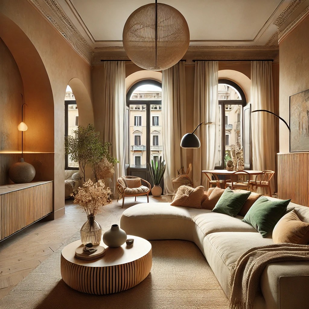Colori ispirati alla natura, come verde salvia, terracotta e beige sabbia, sono protagonisti, offrendo un effetto calmante e armonioso agli spazi abitativi.